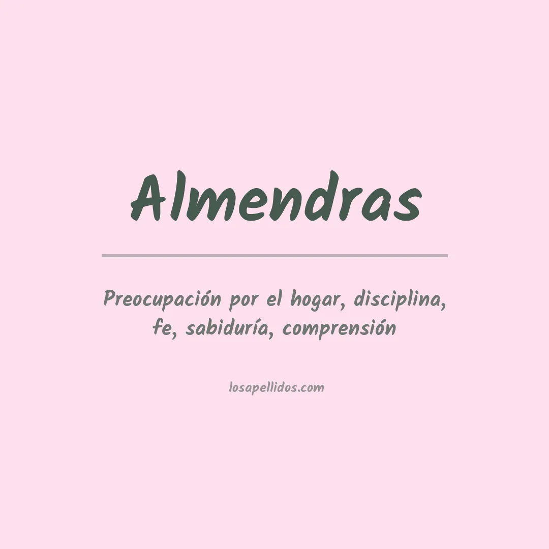 El apellido Almendras proviene del árabe y significa "almendra" o "albérchigo", que se refiere a un tipo de almendra dulce. Como nombre de persona, la palabra se usa para describir a alguien que es dulce, amable o tranquilo.