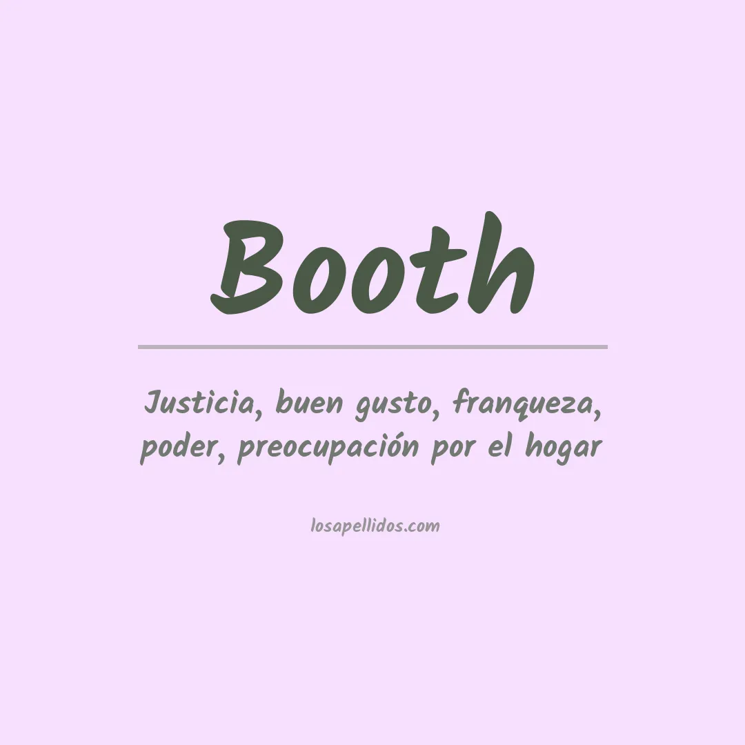 El apellido Booth es un topónimo de origen inglés. Se cree que proviene de la palabra antigua inglesa "both", que significa "cabaña". El apellido se usaba para referirse a alguien que vivía en o cerca de una cabaña, o una construcción pequeña. Esto también podría ser un apodo para alguien que era muy pequeño o vivía en un espacio reducid...o.