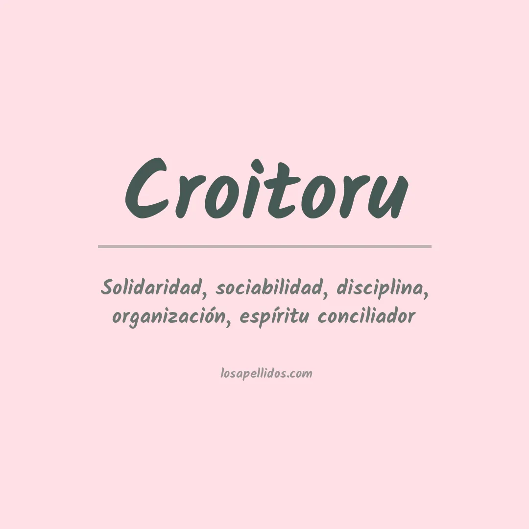 El apellido Croitoru es un nombre de origen rumano que proviene del término latín "curator", que se traduce como "cuidador". Esta palabra fue usada para designar a alguien que tenía la responsabilidad de cuidar la propiedad de otra persona, así como el derecho de administrarla. El apellido Croitoru era comúnmente utilizado para referirse a un ...administrador de fincas rurales y a los propietarios de tierras.