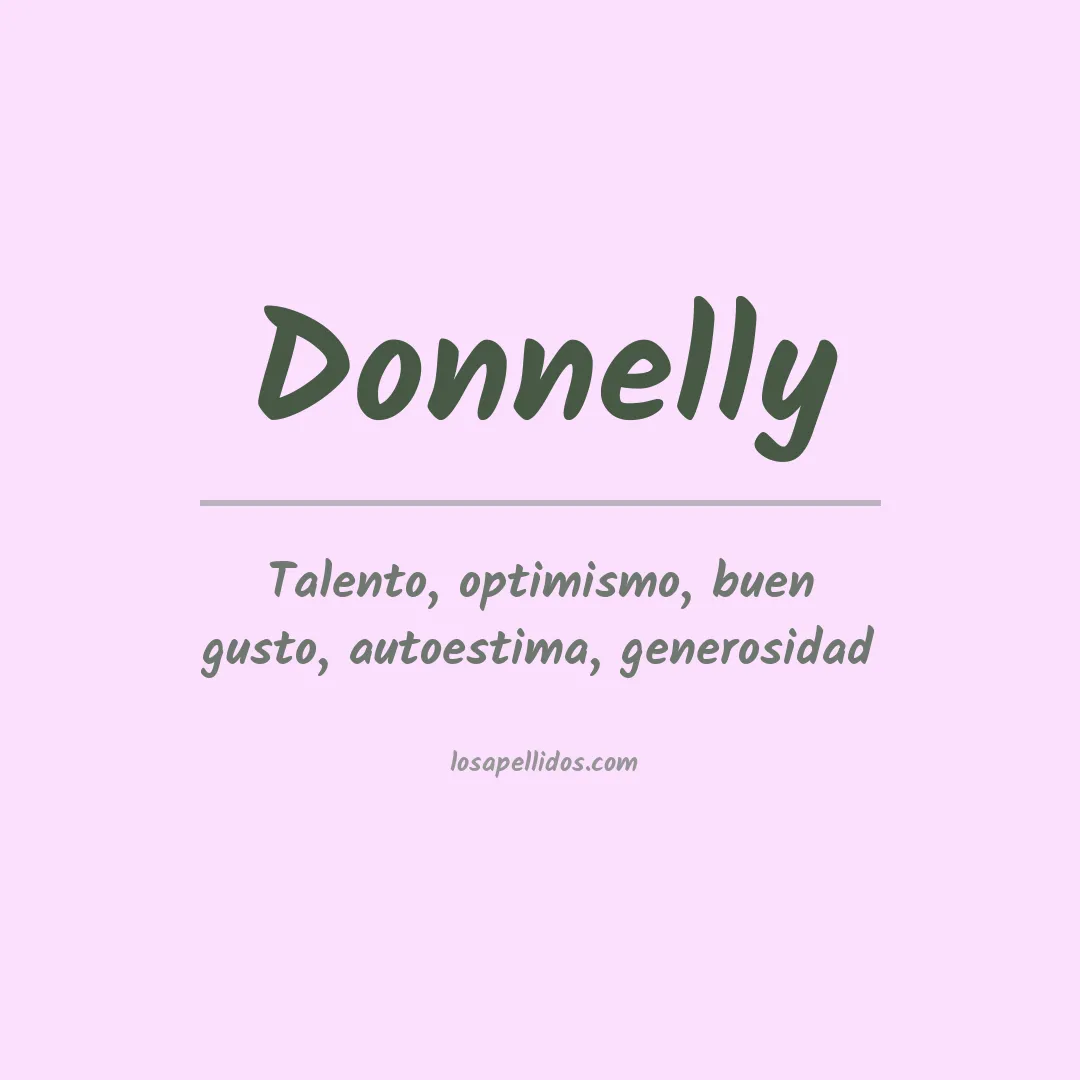 El apellido Donnelly proviene de la región de Ulster en Irlanda. Se cree que el nombre se originó como una forma reducida del nombre gaelico Ó Domhnaill, que significa "descendiente de Domhnall", un antiguo nombre masculino que significa "señor del mundo". El apellido Donnelly es común en la mayoría de las áreas de habla inglesa.