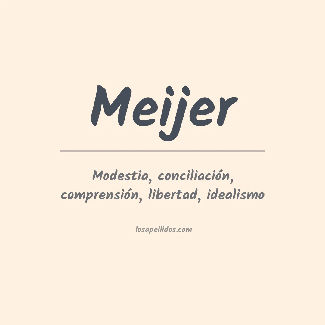 Meijer es un apellido de origen holandés que se deriva del nombre antiguo Meier, que significa "granjero" o "guardián del lugar". El apellido se originó como un título honorífico para los granjeros y los dueños de tierras en Holanda, y ha sido adaptado por muchas culturas desde entonces. Hoy en día, Meijer todavía se usa como apellido comú...nmente en Holanda, Alemania y algunas partes de Europa Central. En Estados Unidos, Meijer es el nombre de una cadena minorista con sede en Michigan.
