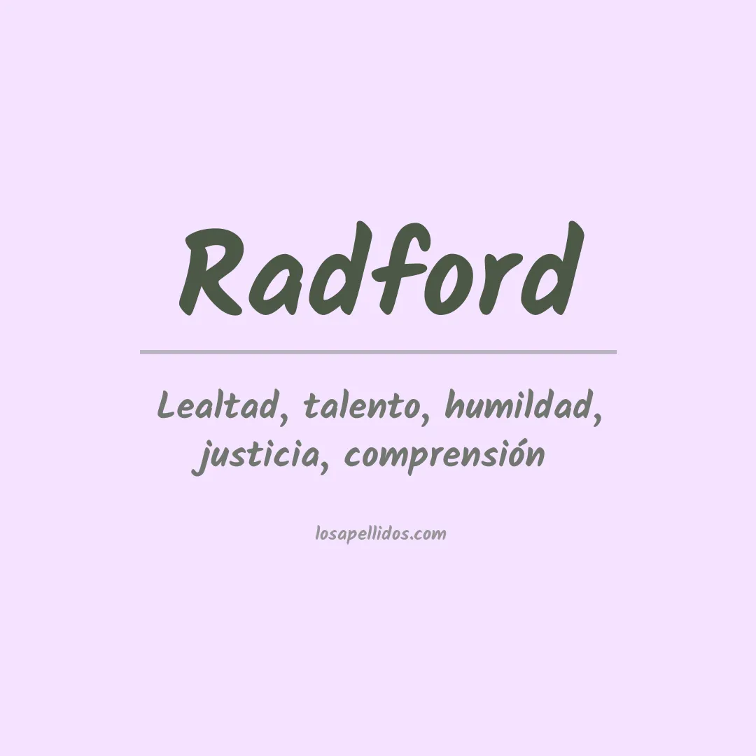 El apellido Radford proviene del inglés antiguo y significa "ford en el río". Se originó como un topónimo para aquellos que vivían cerca de un ford en un río, lo que les permitía cruzar el agua con facilidad. También puede referirse a un lugar llamado Radeford, que se encuentra cerca de la localidad de Gotemburgo, Suecia.
