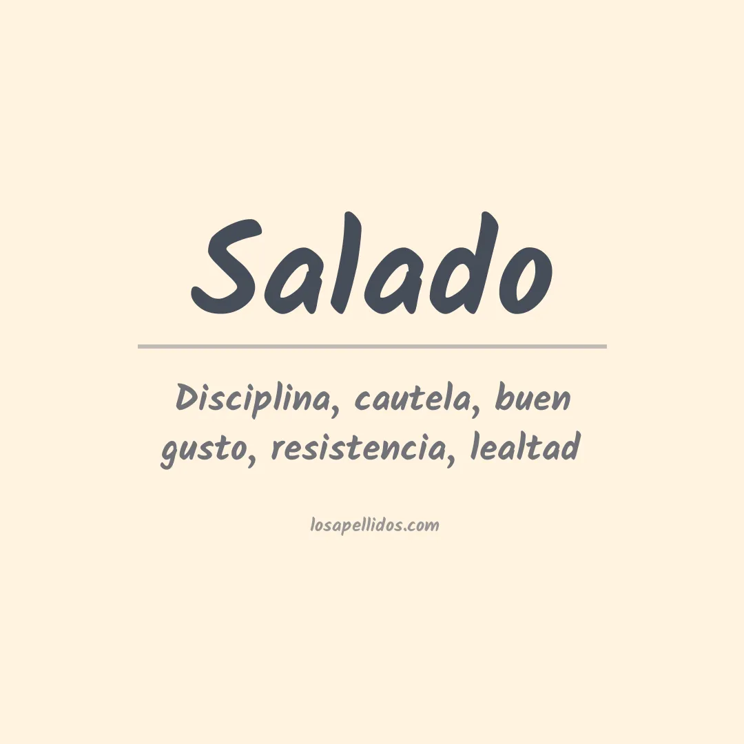 El apellido Salado es un topónimo de origen gallego y vasco, que significa literalmente "salado" o "salobre". Esta palabra se refiere a un lugar con agua salada o salobre, como una laguna costera o un río. También puede hacer referencia a alguien que vive cerca de dicho lugar.