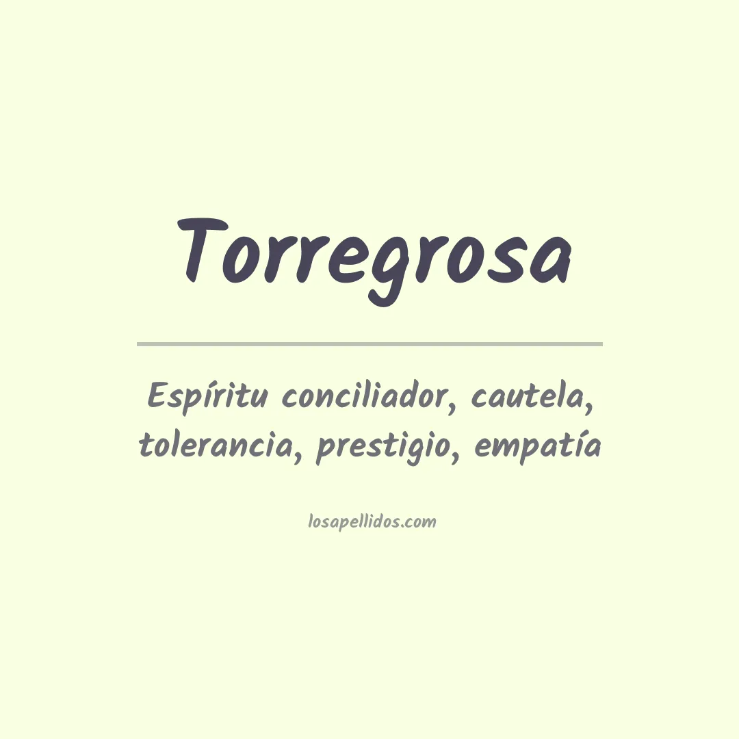 El apellido Torregrosa procede del latín torre grossa, que literalmente significa "gran torre" y se usaba para describir a un individuo fuerte y valiente. Esto refleja el pasado militar de la familia o el carácter de las personas de esta línea familiar. Por lo general, quienes tienen este apellido son orgullosos de sus raíces y su historia.